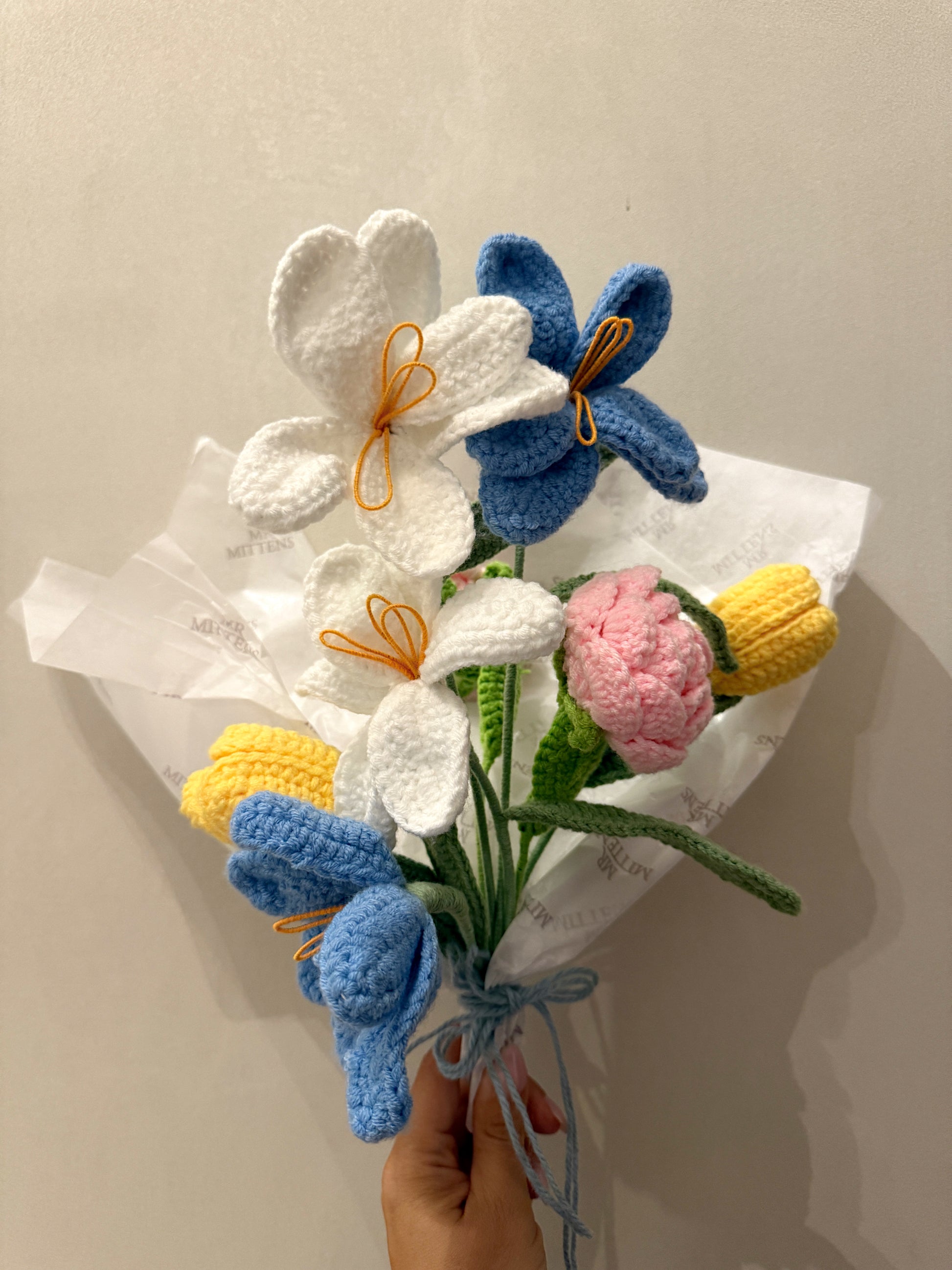 This beautifully hand-crafted crochet bouquet is part of our limited Mr Mittens collection, created with care, time, and meticulous attention to detail. Each flower is individually crocheted by hand, resulting in a tactile, lasting alternative to a fresh bouquet—one that can be cherished forever.