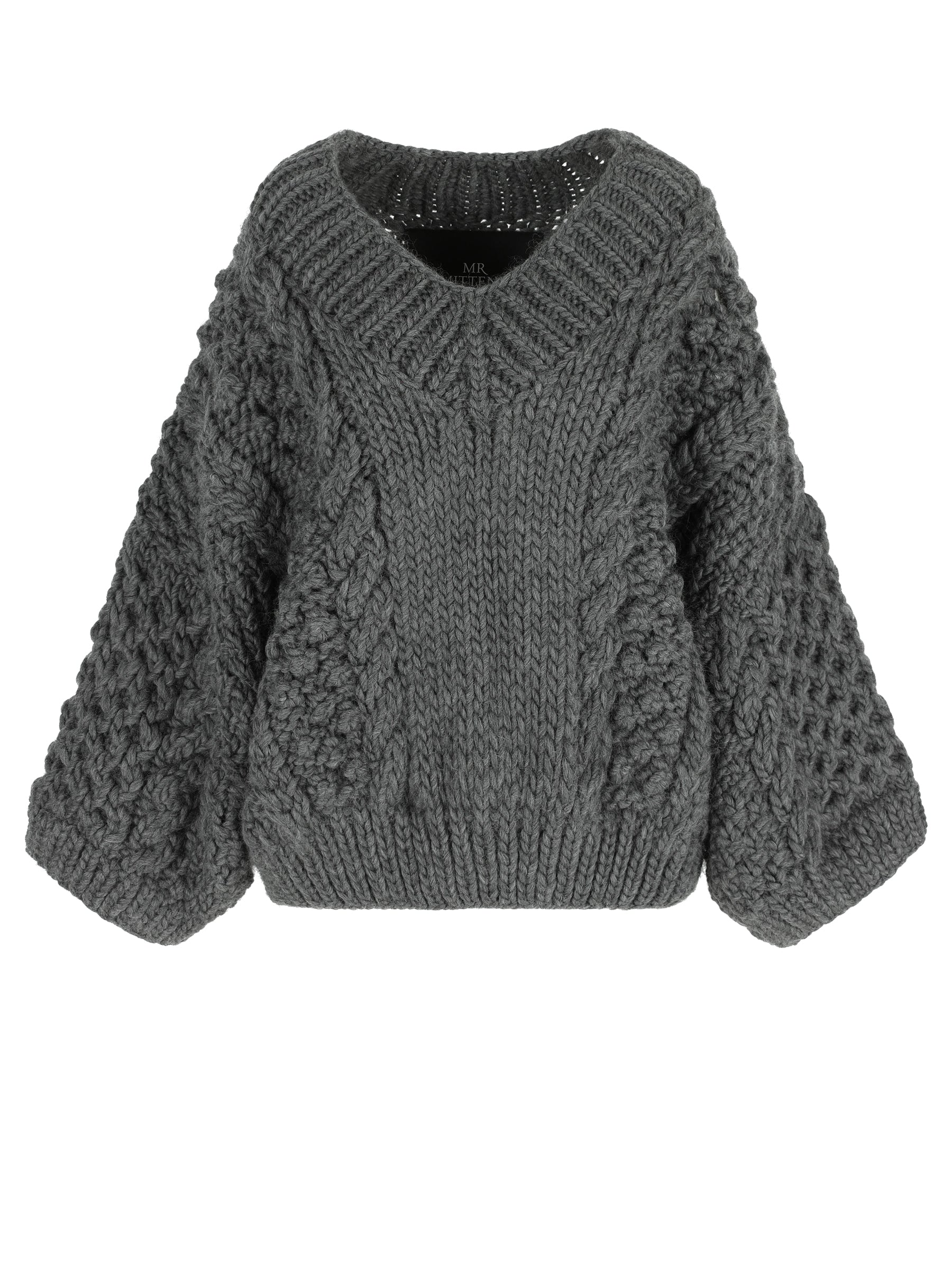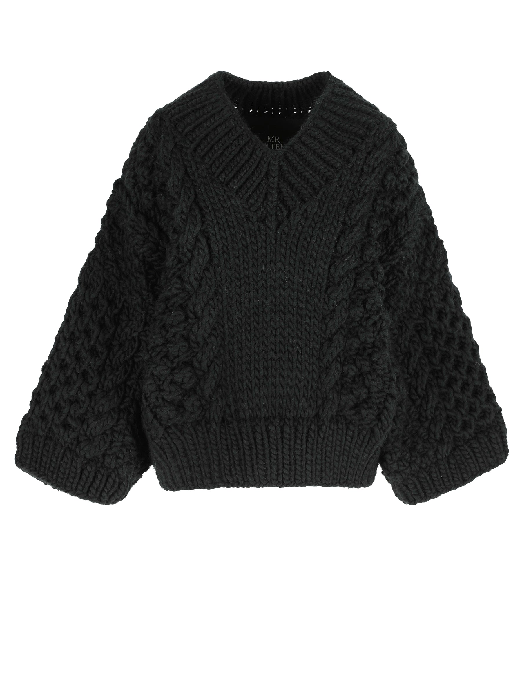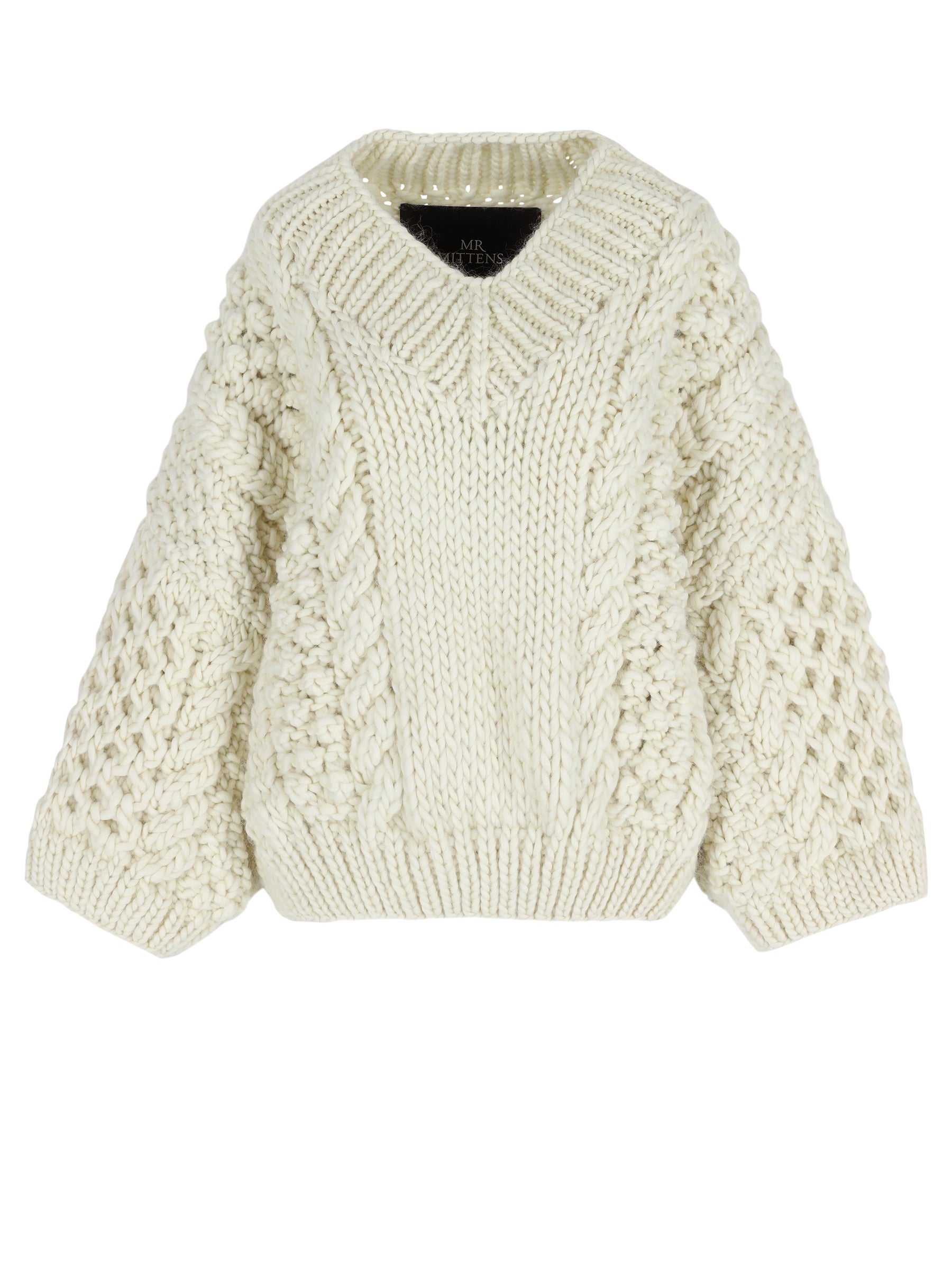 This Honey V-neck design is both unique and on-trend. Crafted entirely from 100% chunky wool, it showcases the signature Mr. Mittens' style in every detail. With its oversized fit and special pattern, this jumper becomes a true standout piece, embodying both comfort and individuality