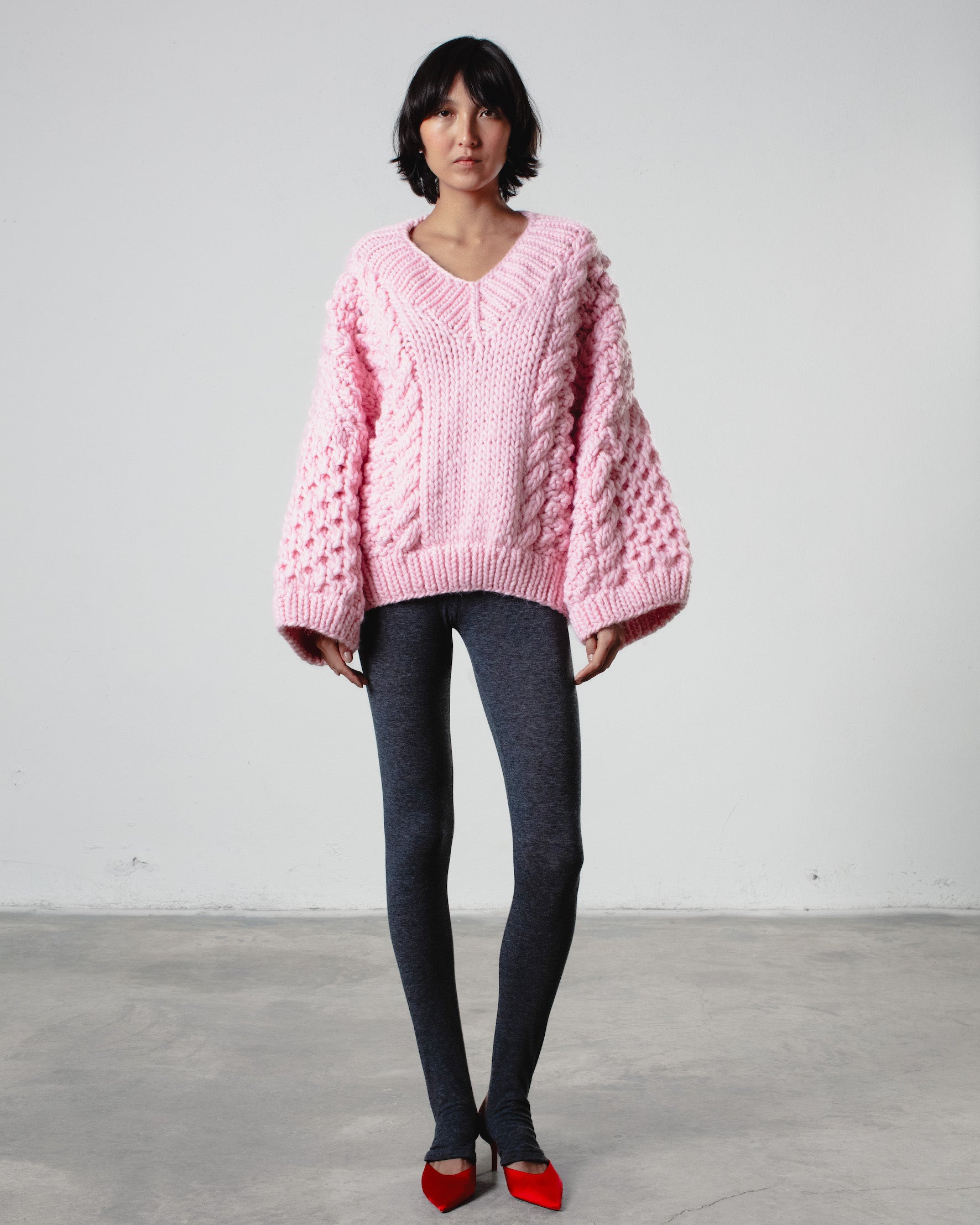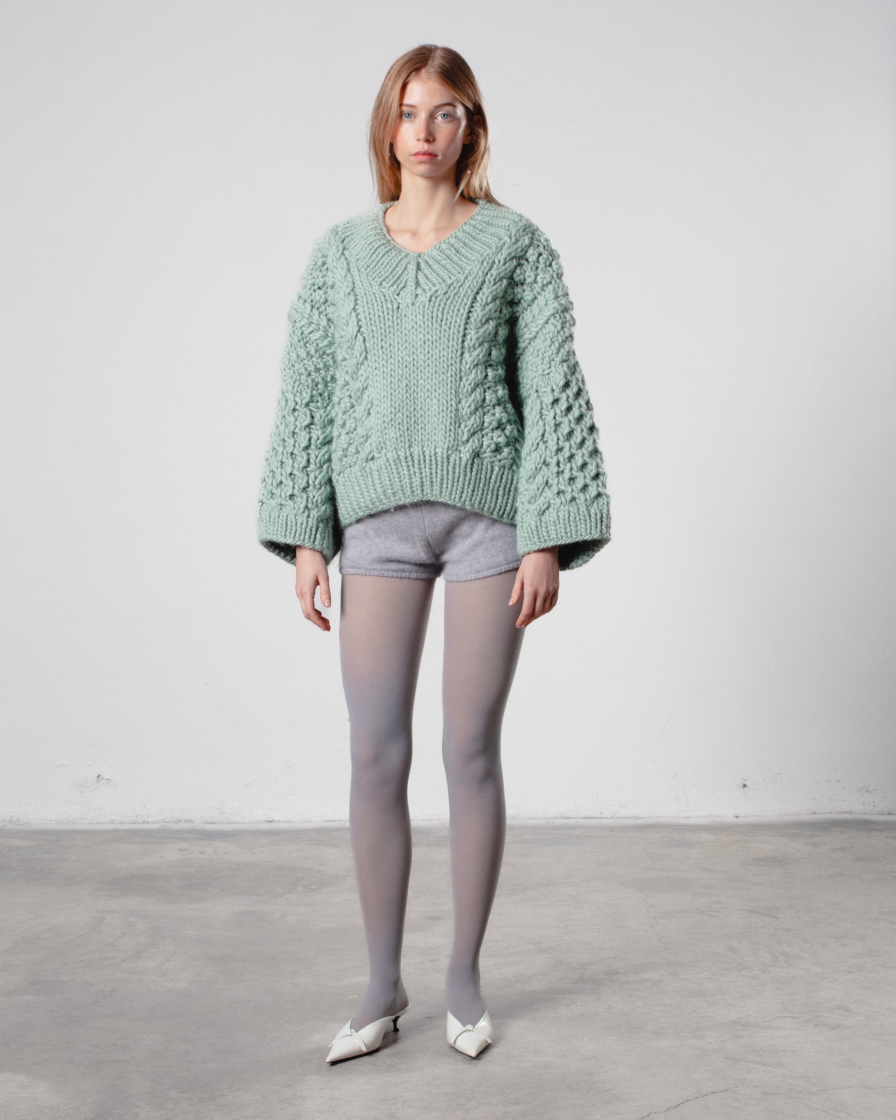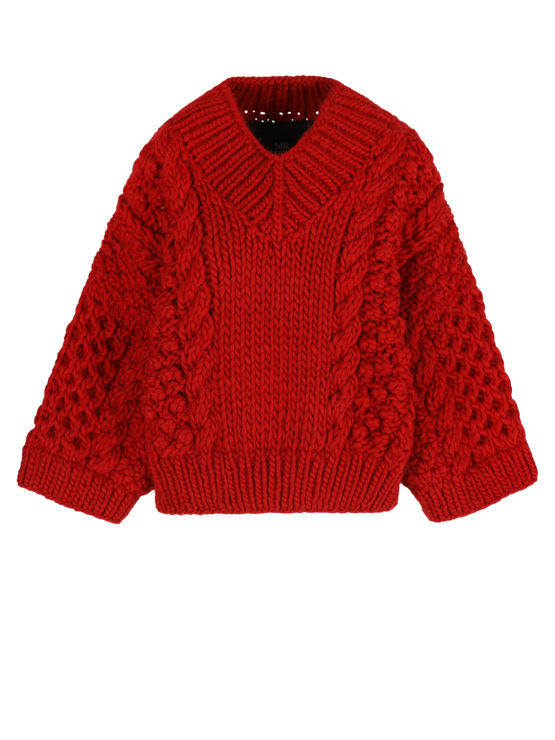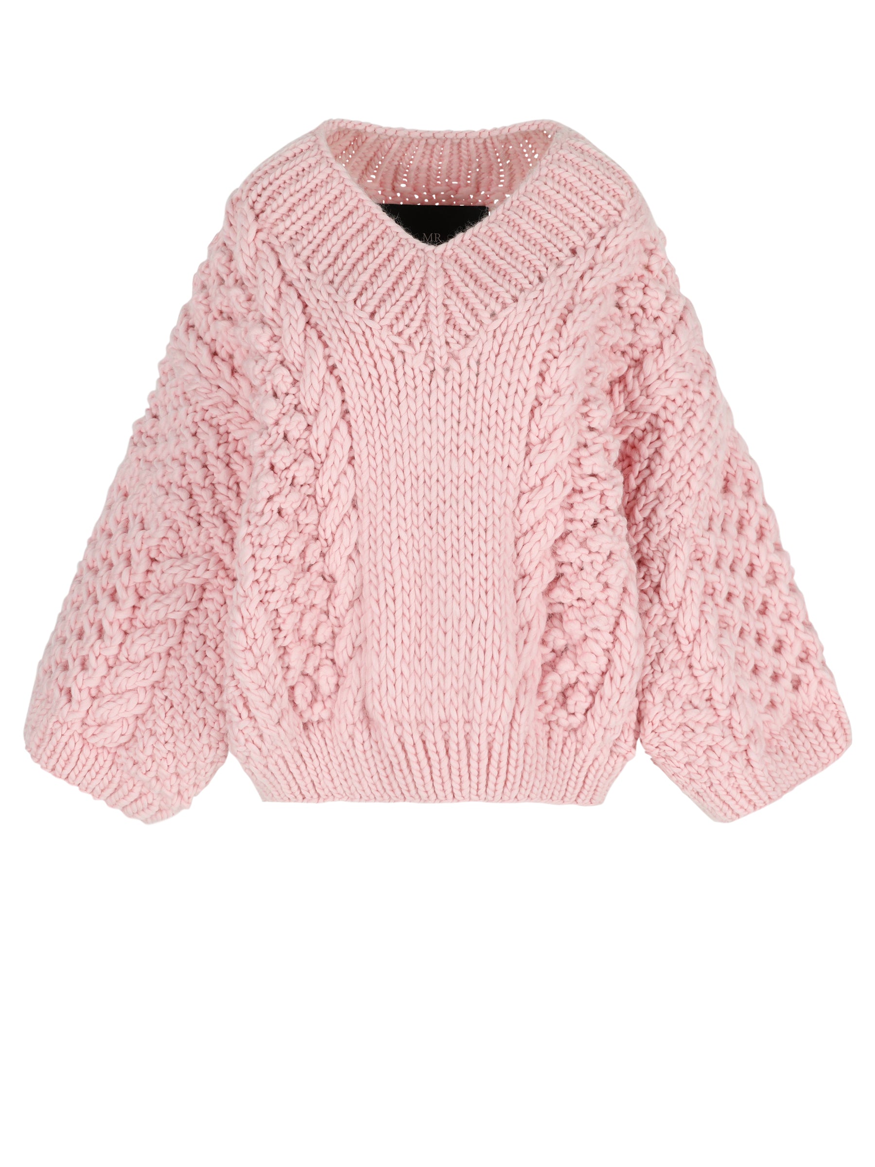 This Honey V-neck design is both unique and on-trend. Crafted entirely from 100% chunky wool, it showcases the signature Mr. Mittens' style in every detail. With its oversized fit and special pattern, this jumper becomes a true standout piece, embodying both comfort and individuality
