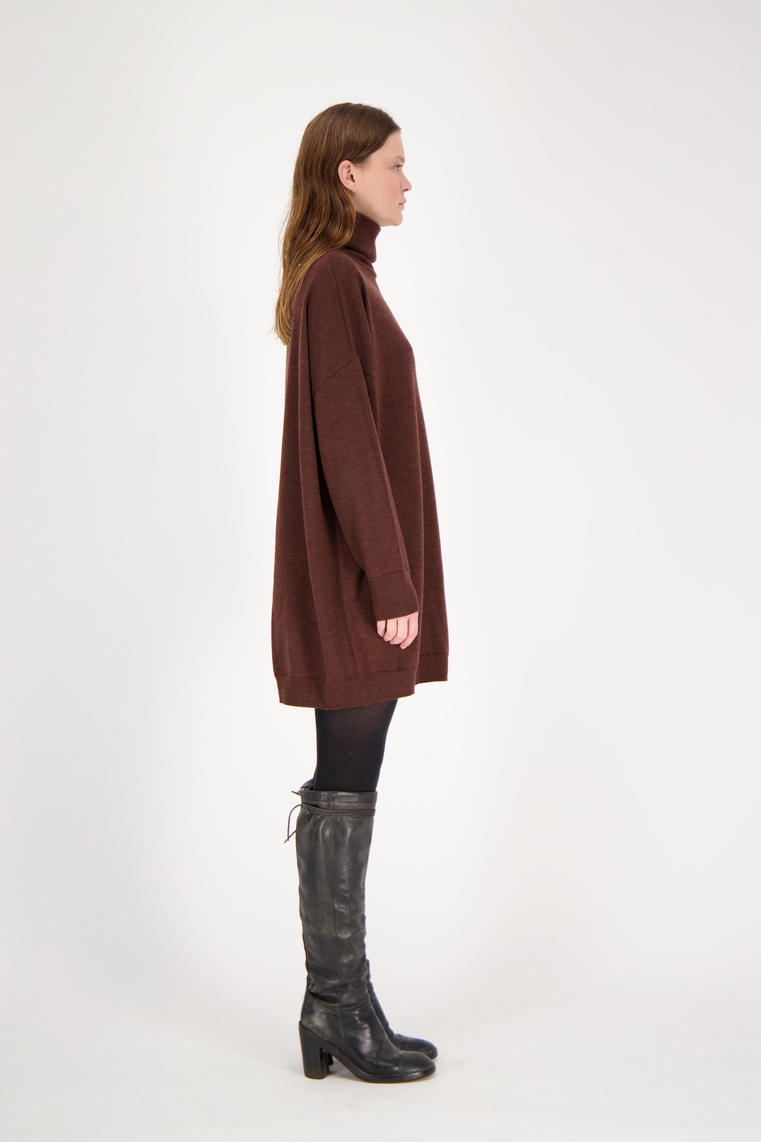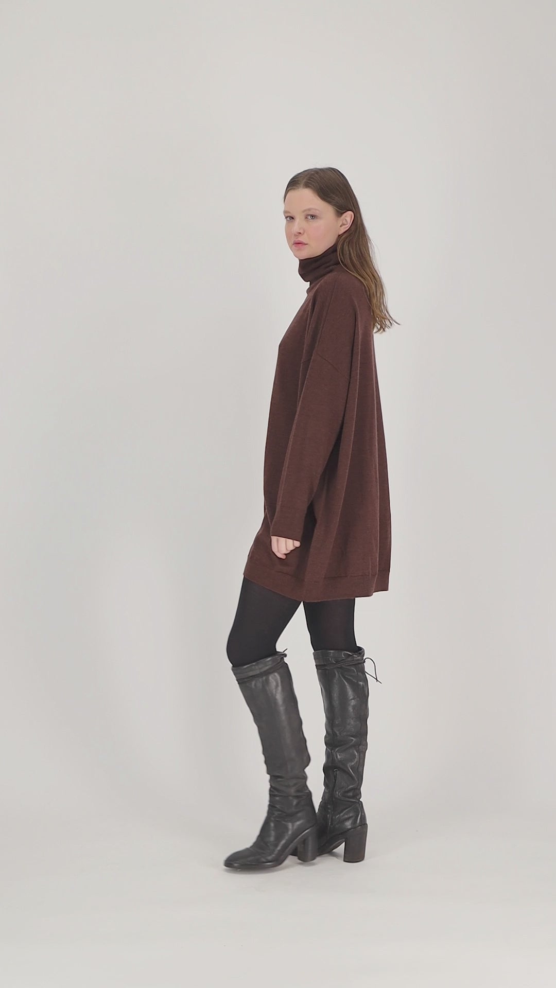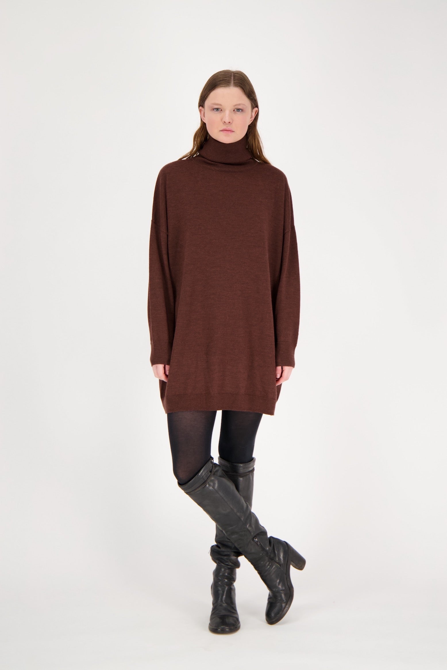 This mini high neck dress is specially crafted for the chilly season, featuring a cozy and chic thick rollneck. With its above-the-knees length and long sleeves, it's the epitome of comfort-meets-style. Versatile and adaptable, you can pair it with high boots for a fashion-forward look or leggings for extra warmth. Explore a variety of styling options, making each ensemble uniquely your own.